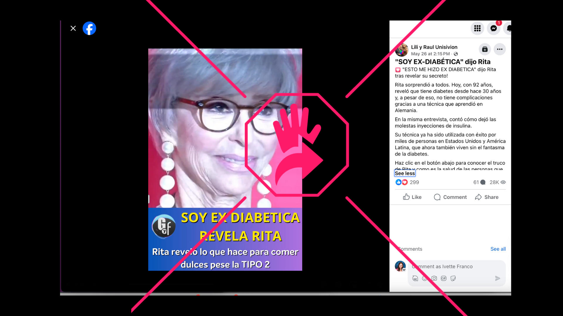 En otro momento, Estefan supuestamente respalda lo que dice Moreno al afirmar que la actriz “se mantiene hasta esta edad sin complicaciones de la diabetes” con “unas simples gotitas que utiliza en su jugo por las mañanas”. El audio invita a la audiencia a conocer más sobre estas supuestas “gotitas que hacen milagros” y en la parte inferior del clip se observa un texto que dice: “Rita reveló lo que hace para comer dulces pese la [diabetes] tipo 2”.