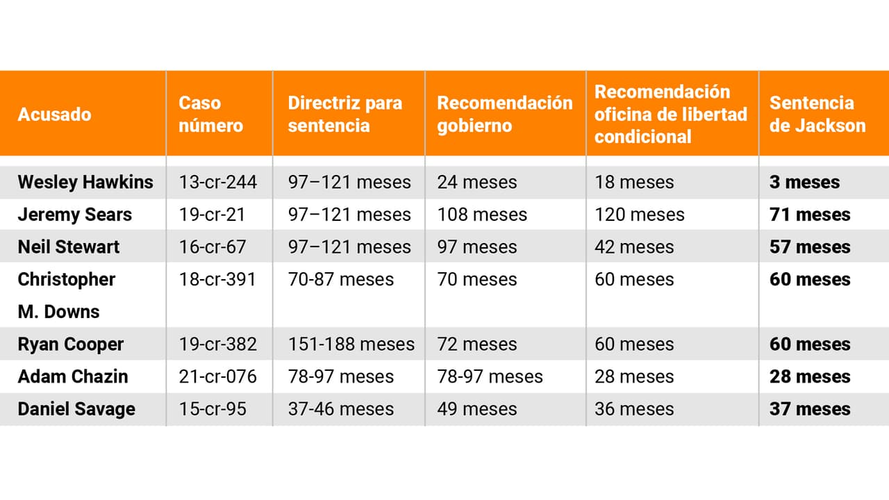 A continuación se presenta una lista de esos casos, con los rangos de las directrices para sentencia, las recomendaciones de la fiscalía y de la oficina de libertad condicional y la sentencia de Jackson [en cada uno]: