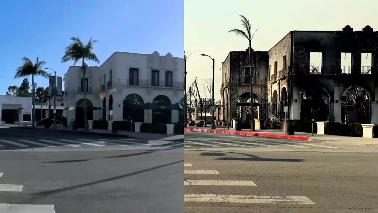 En este video comparativo se pueden ver las lujosas calles y construcciones de Palisades Village y Pacific Palisades antes de que quedaran en ruinas tras los incendios forestales. Sigue las últimas noticias en Univision.