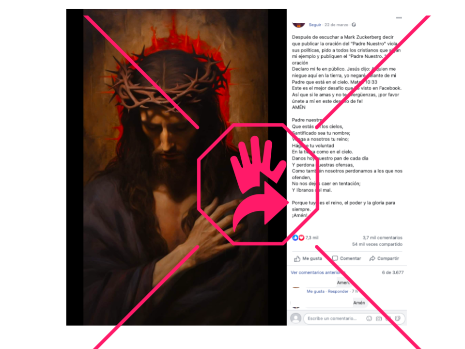 “Después de escuchar a Mark Zuckerberg decir que publicar la oración del ‘Padre Nuestro’ viola sus políticas, pido a todos los cristianos que sigan mi ejemplo y publiquen el ‘Padre Nuestro’ [...]. Este es el mejor desafío que he visto en Facebook. Así que si le amas y no te avergüenzas, ¡por favor únete a mí en este desafío de fe!”, dice una publicación difundida en esa red social el 22 de marzo de 2024, que cuenta con más de 7,300 reacciones y ha sido compartida 54,000 veces hasta el 9 de abril.