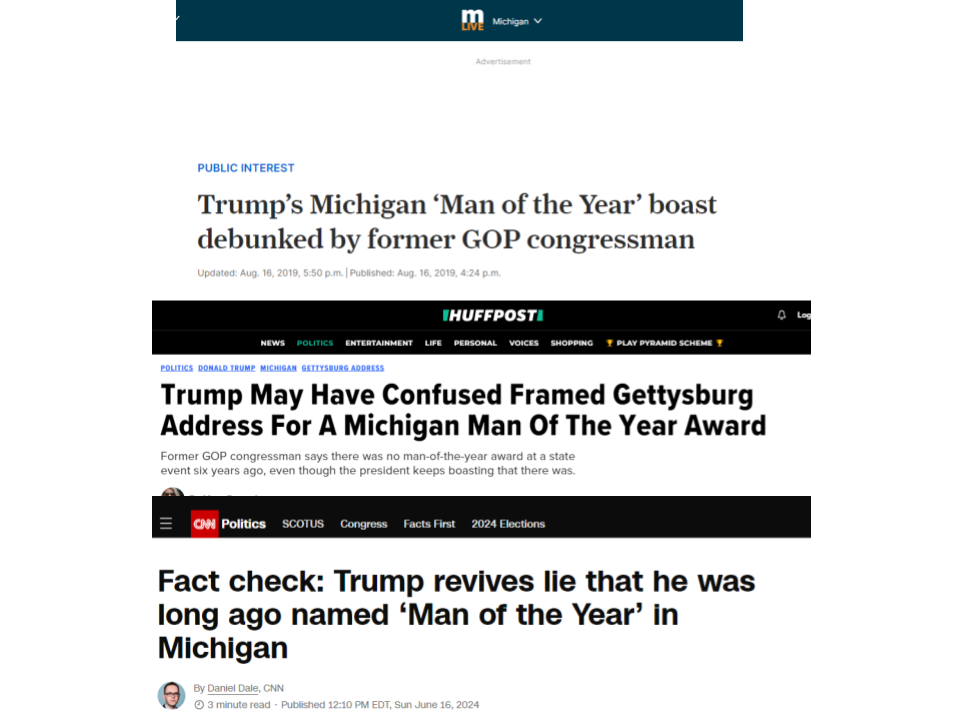The Detroit News, uno de los dos periódicos más grandes de esa ciudad, tiene una reseña de 2019 en la que afirman que “nadie en Michigan parece saber de qué está hablando” (Trump). The Detroit News confirma lo verificado por FactCheck.org de voz del excongresista Dave Trott, quien contó que fue el organizador de la cena de Lincoln en Michigan (2013), y que no estaban entregando premios al “hombre del año”.