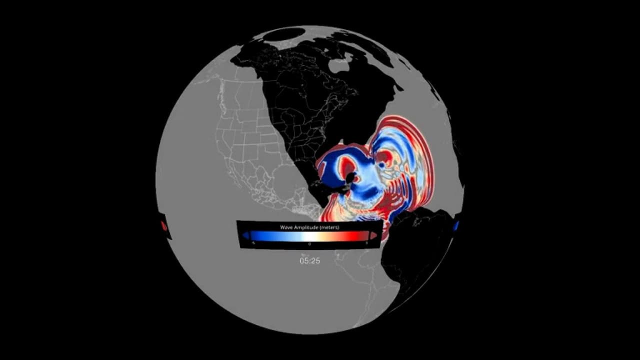 Una hora después del impacto, el tsunami había llegado al norte del Océano Atlántico. Cuatro horas después las olas atravesaron el canal de América Central (que antes separaba ambos hemisferios del continente) y llegaron al Océano Pacífico.