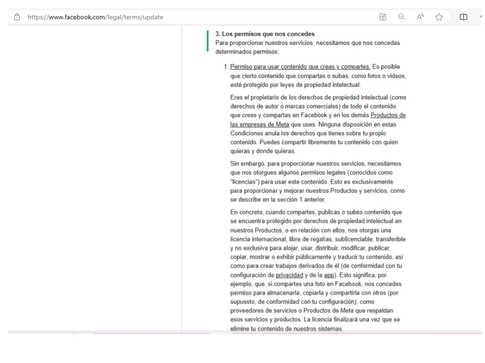 Las licencias (permisos legales) que los usuarios otorgan a Meta están relacionadas a las concesiones sobre el contenido, uso de nombre, foto de perfil e información, así como actualización del software. “En concreto, cuando compartes, publicas o subes contenido que se encuentra protegido por derechos de propiedad intelectual en nuestros Productos, o en relación con ellos, nos otorgas una licencia internacional, libre de regalías, sublicenciable, transferible y no exclusiva para alojar, usar, distribuir, modificar, publicar, copiar, mostrar o exhibir públicamente y traducir tu contenido, así como para crear trabajos derivados de él (de conformidad con tu configuración de privacidad y de la app)”, indica Meta.