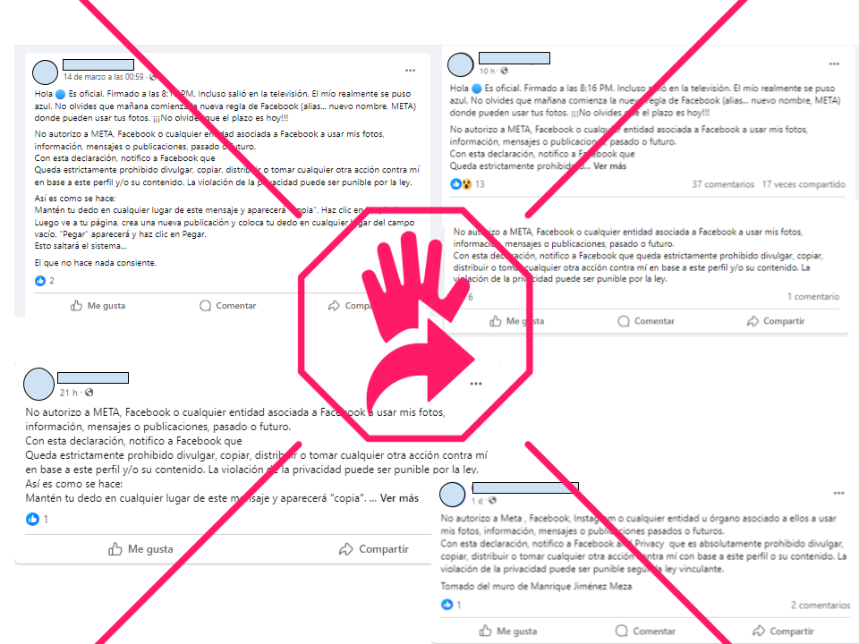 En decenas de publicaciones que circulan en Facebook se lee un texto que supuestamente prohíbe a Meta, la empresa propietaria de esa red social, el uso de los contenidos publicados en ella. “No autorizo a Meta, Facebook o cualquier entidad asociada a Facebook a usar mis fotos, información, mensajes o publicaciones, pasado o futuro. Con esta declaración, notifico a Facebook que queda estrictamente prohibido divulgar, copiar, distribuir o tomar cualquier otra acción contra mí en base a este perfil y/o su contenido. La violación de la privacidad puede ser punible por la ley”, dice el mensaje.
