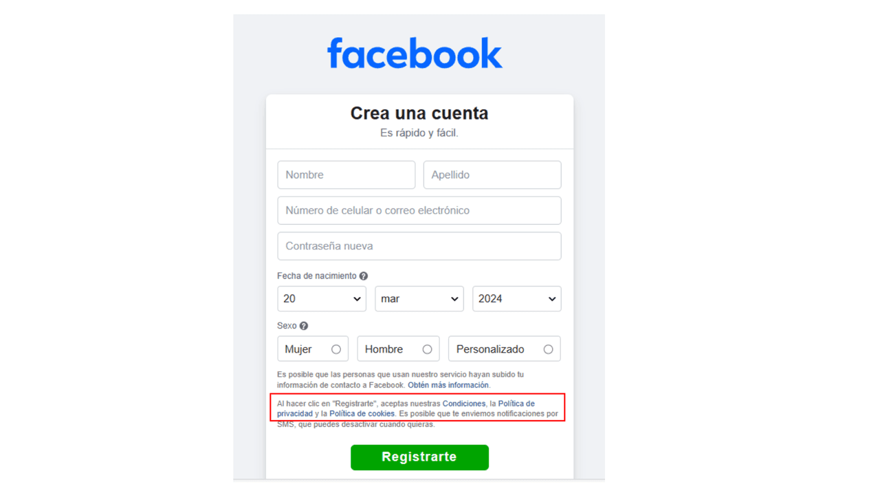 Las personas al abrir una cuenta en Facebook aceptan las condiciones del servicio y la política de privacidad.