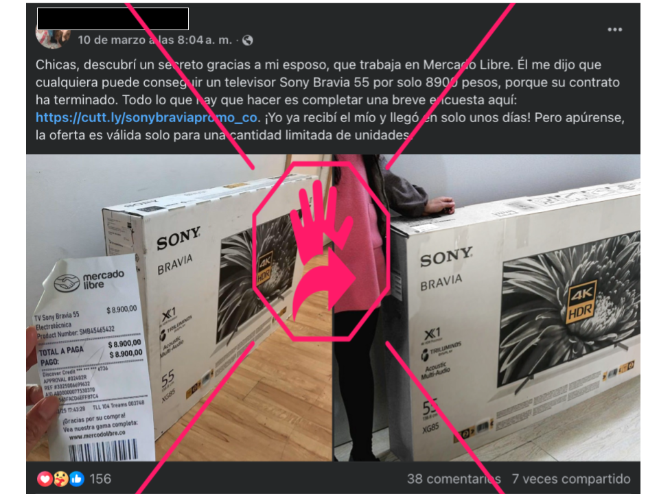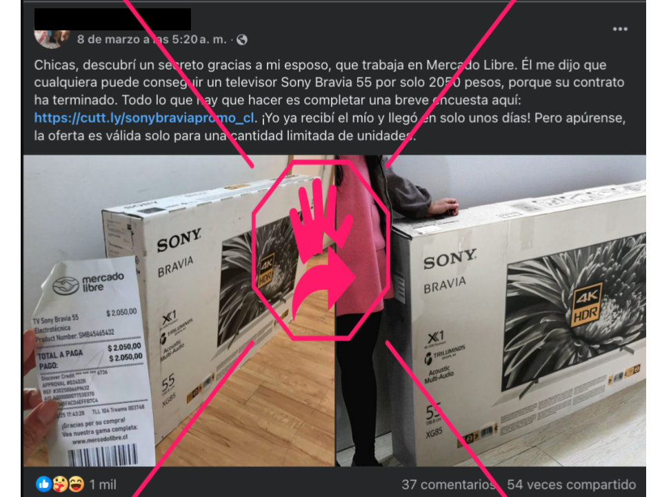 “Chicas, descubrí un secreto gracias a mi esposo, que trabaja en Mercado Libre. Él me dijo que cualquiera puede conseguir un televisor Sony Bravia 55 por solo 2050 pesos, porque su contrato ha terminado. Todo lo que hay que hacer es completar una breve encuesta aquí: (enlace) ¡Yo ya recibí el mío y llegó en solo unos días! Pero apúrense, la oferta es válida solo para una cantidad limitada de unidades”, dice el mensaje que circula en Facebook.