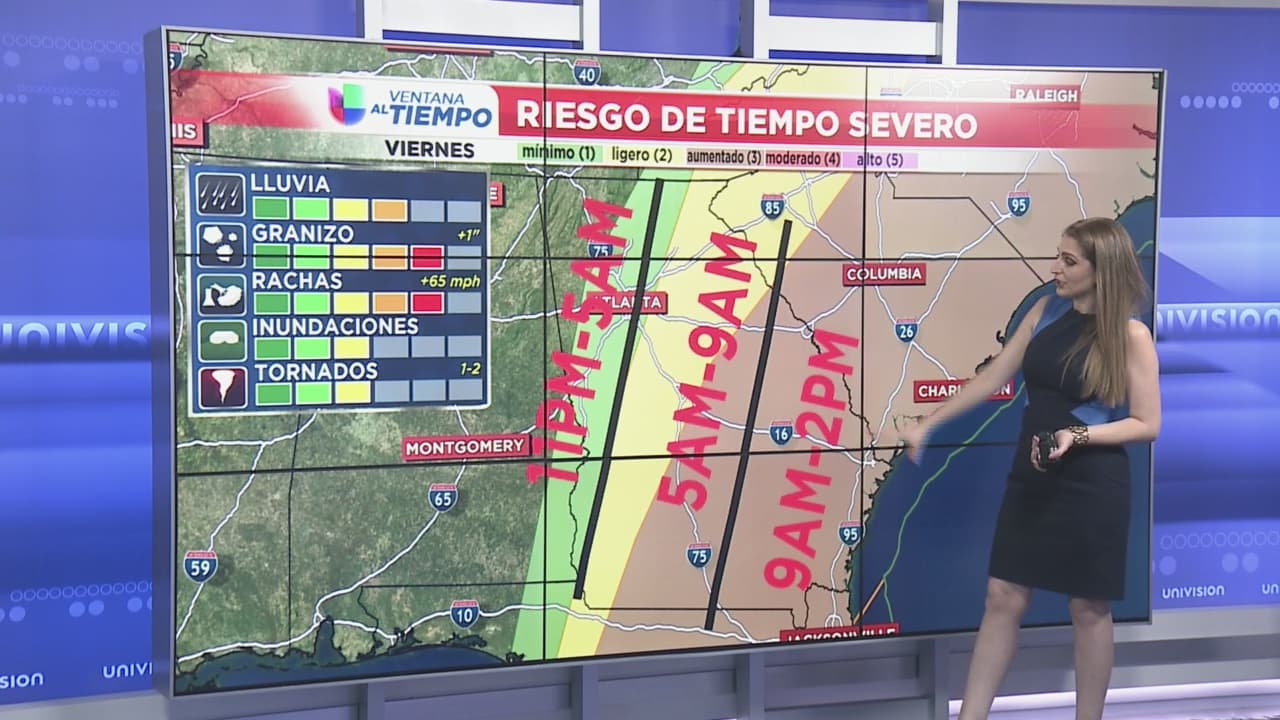 Según el meteorólogo de Univision Noticias Albert Martínez, las tormentas más activas de este jueves se concentrarán en el sur del valle de Mississippi, Georgia y Alabama, y los fuertes vientos, lluvias, rayos y granizo son los mayores riesgos. Para el viernes, se moverá hacia las Carolinas y el norte de Florida. Pero para el fin de semana las condiciones mejorarán y se espera que sea soleado.