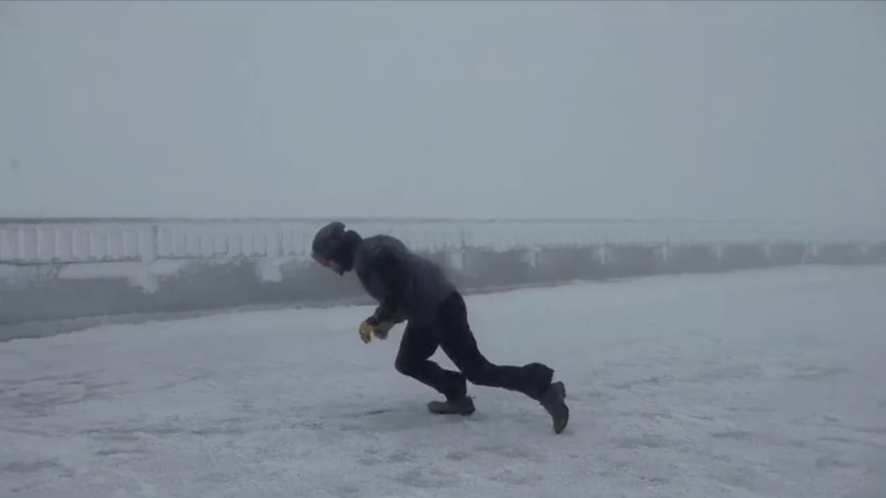 Un hombre del observatorio Mount Washington tomó un breve descanso esta mañana para disfrutar del viento y las condiciones invernales en el muelle.