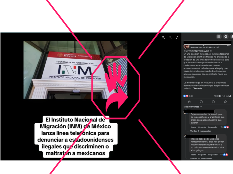 En Facebook y Treads circula una publicación que asegura que el Instituto Nacional de Migración de México (INM) lanzó una línea telefónica para “denunciar estadounidenses ilegales que discriminen o maltraten a mexicanos”. De acuerdo con el mensaje, tras realizar la denuncia la dependencia analizará el caso y si confirma que la persona en cuestión “está en el país de manera ilegal se procederá a su deportación”, pero eso es falso. Las autoridades migratorias mexicanas dijeron a elDetector vía telefónica que no es verdad.