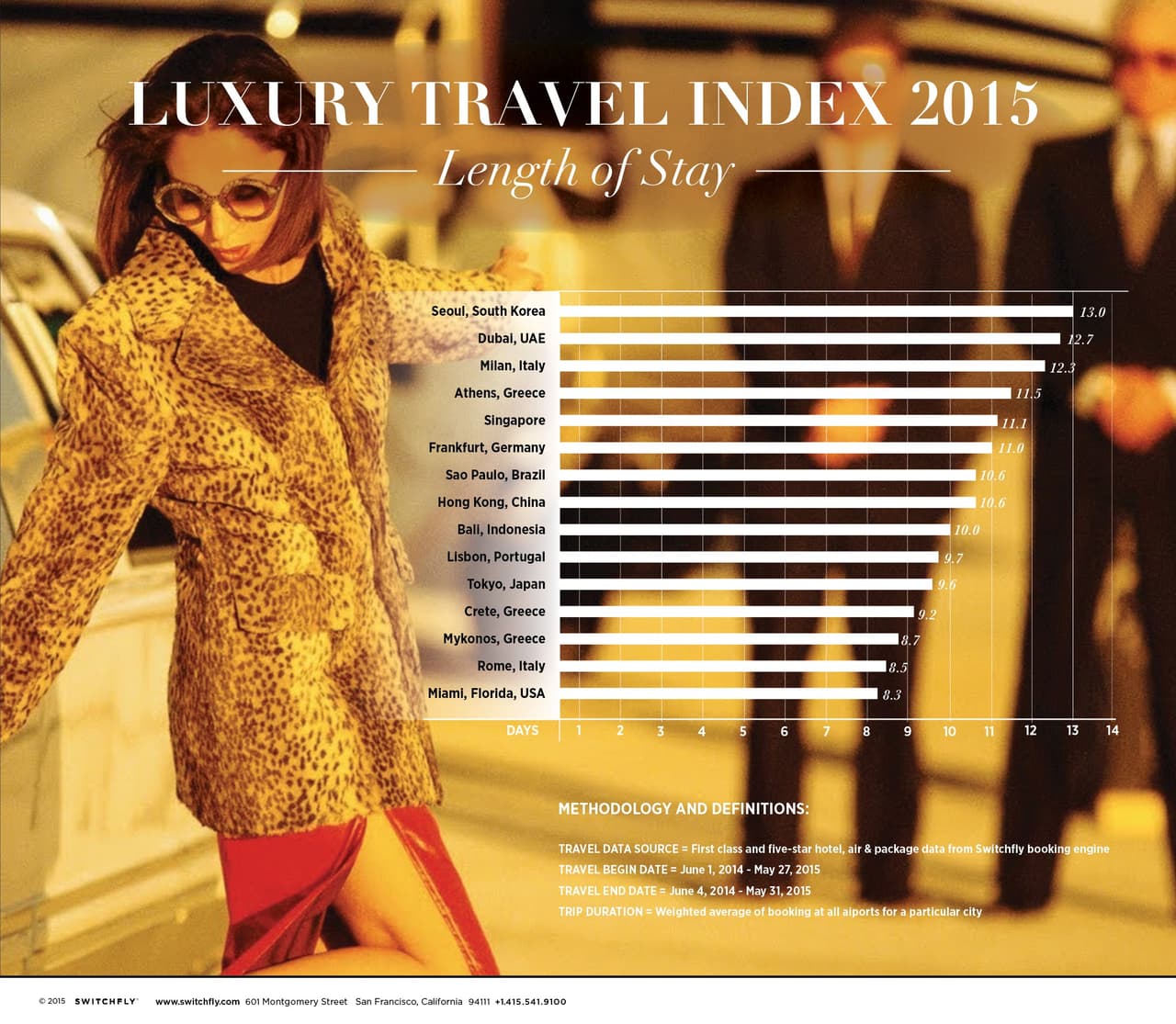 A Seúl le sigue Dubai, en los Emiratos Árabes. La vista a las playas de este lado del mundo, junto con los lujos extremos que provee la ciudad, la ubican entre los destinos más codiciados. A continuación una gráfica que muestra los primeros 15 destinos turísticos de lujo en todo el mundo y el promedio de estadía de los visitantes.