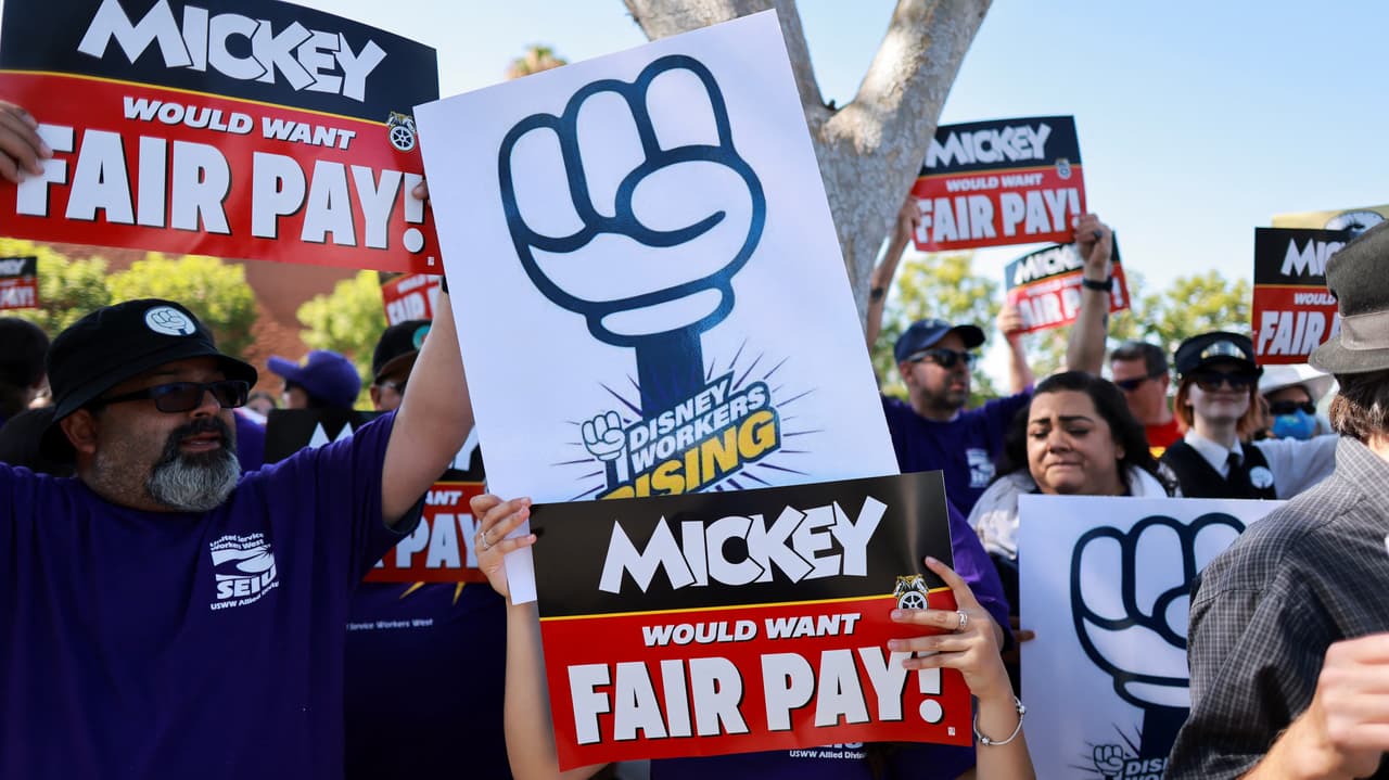 Los trabajadores de los parques de atracciones y hoteles de Disney en California se manifestaron en la entrada esta semana en medio de una batalla legal contra la compañía a la que acusan de prácticas laborales injustas.