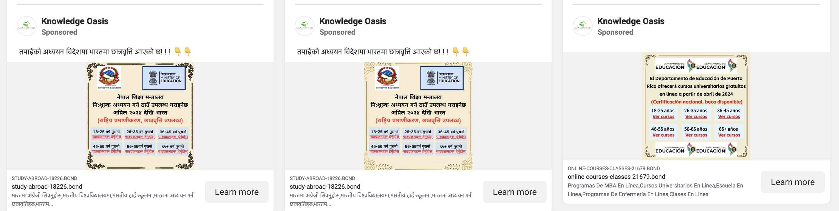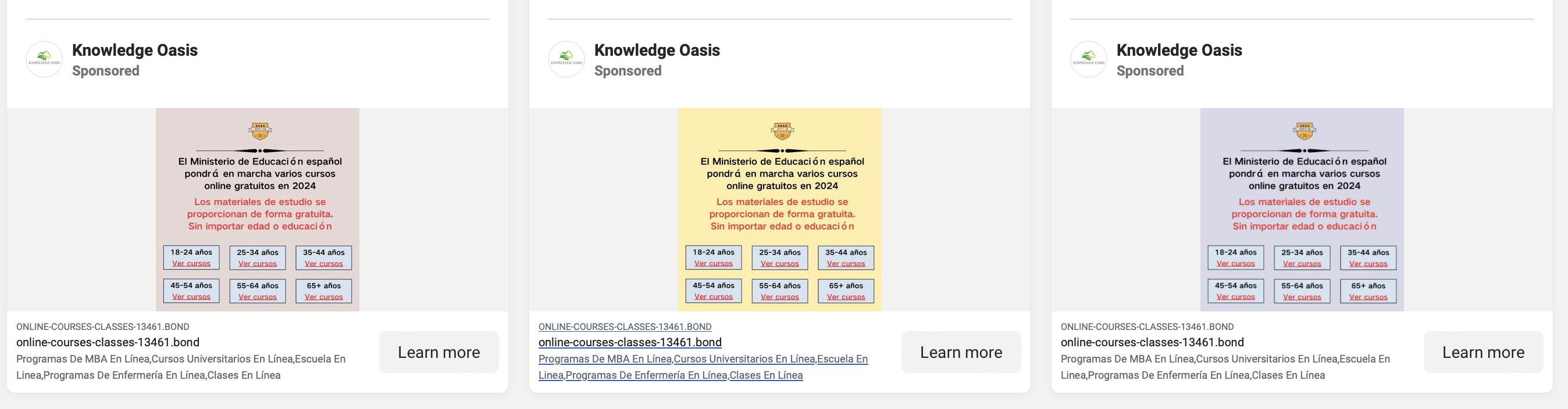 Además, confirmamos que esta cuenta actualmente tiene una campaña en la que promueven publicaciones con un patrón similar en el que ofrecen cursos gratuitos por parte de diferentes gobiernos, como España, Ecuador y Puerto Rico, entre otros, incluso escritos en diferentes idiomas.