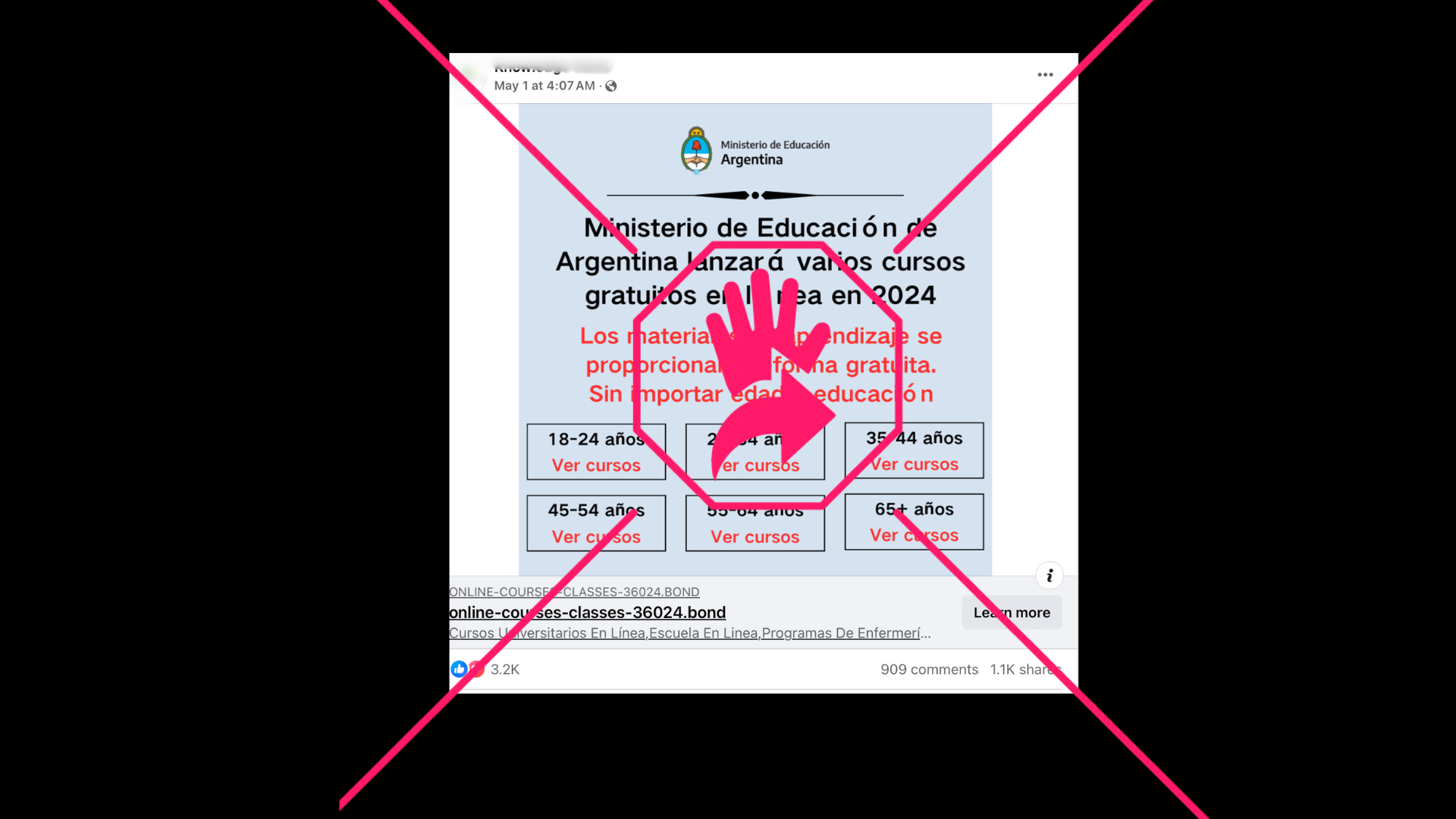 Es falso que los ministerios de Educación de Perú y Argentina ofrezcan esos cursos en línea gratuitos, como señalan avisos compartidos en Facebook. En elDetector verificamos que ninguna de las publicaciones proviene de alguna cuenta oficial de esos gobiernos. "El Ministerio de Educación no ofrece cursos universitarios gratuitos", confirmó Yahella Yi, de la Dirección General de Educación Superior Universitaria, quien nos proporcionó también un comunicado en el que se alerta sobre publicaciones falsas en redes y se destaca que solamente es válida la información si se comparte en sus fuentes oficiales. La Secretaría de Educación de Argentina indicó que "desde 2024 ya no se denomina ministerio", como muestra el post falso, y agregó también que "cualquier curso se publica en las redes oficiales". Además, en mayo de 2024, medios argentinos advirtieron que esta publicación analizada se trataba de una ciberestafa. Lee aquí cómo escogemos y asignamos nuestras etiquetas en elDetector.