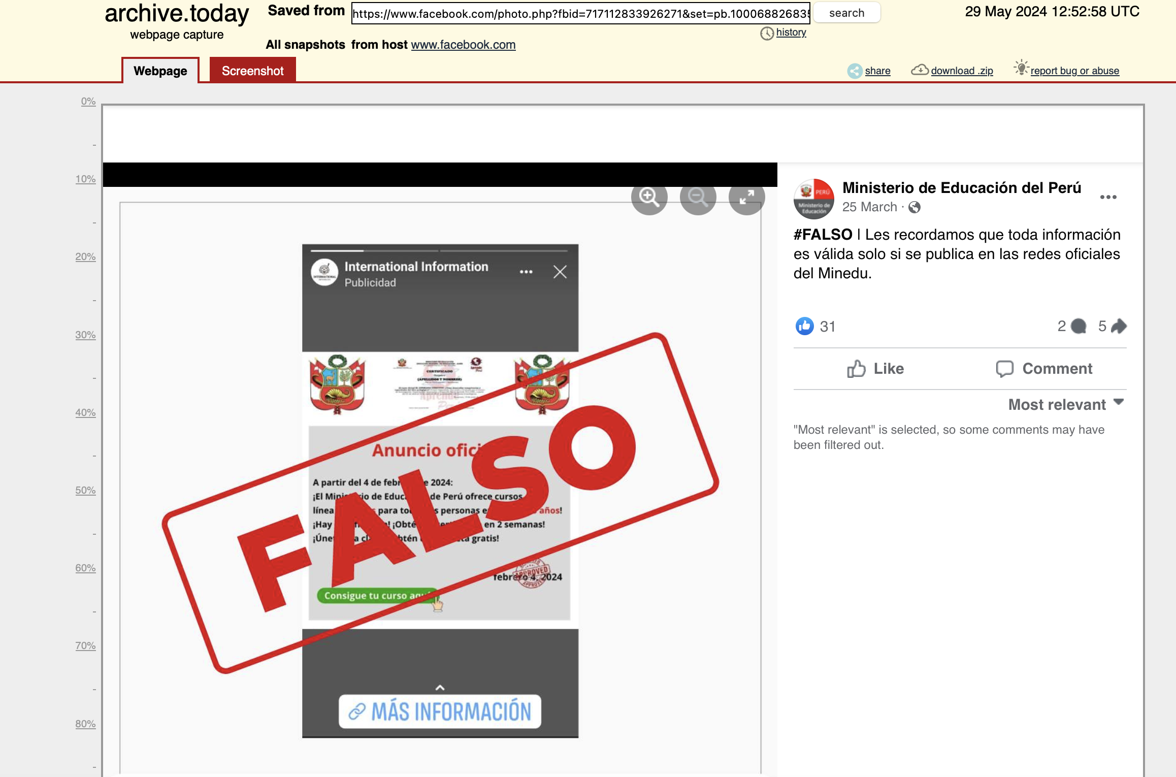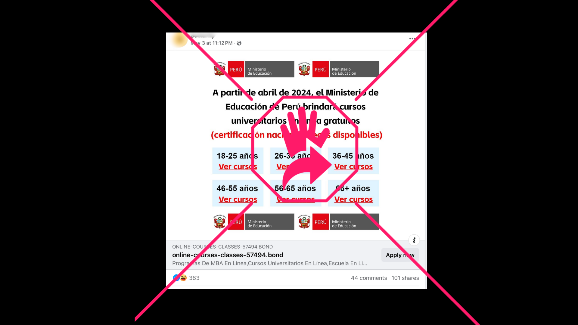 “A partir de abril de 2024, el Ministerio de Educación de Perú brindará cursos universitarios en línea gratuitos”, dice el post difundido el 3 de mayo de 2024. En otra parte del texto se lee: “Certificación nacional, becas disponibles”. En la publicación se observa el logo de este ente y secciones en las que detallan los supuestos cursos gratuitos segmentados por edad, que empiezan a partir de los 18 años de edad.