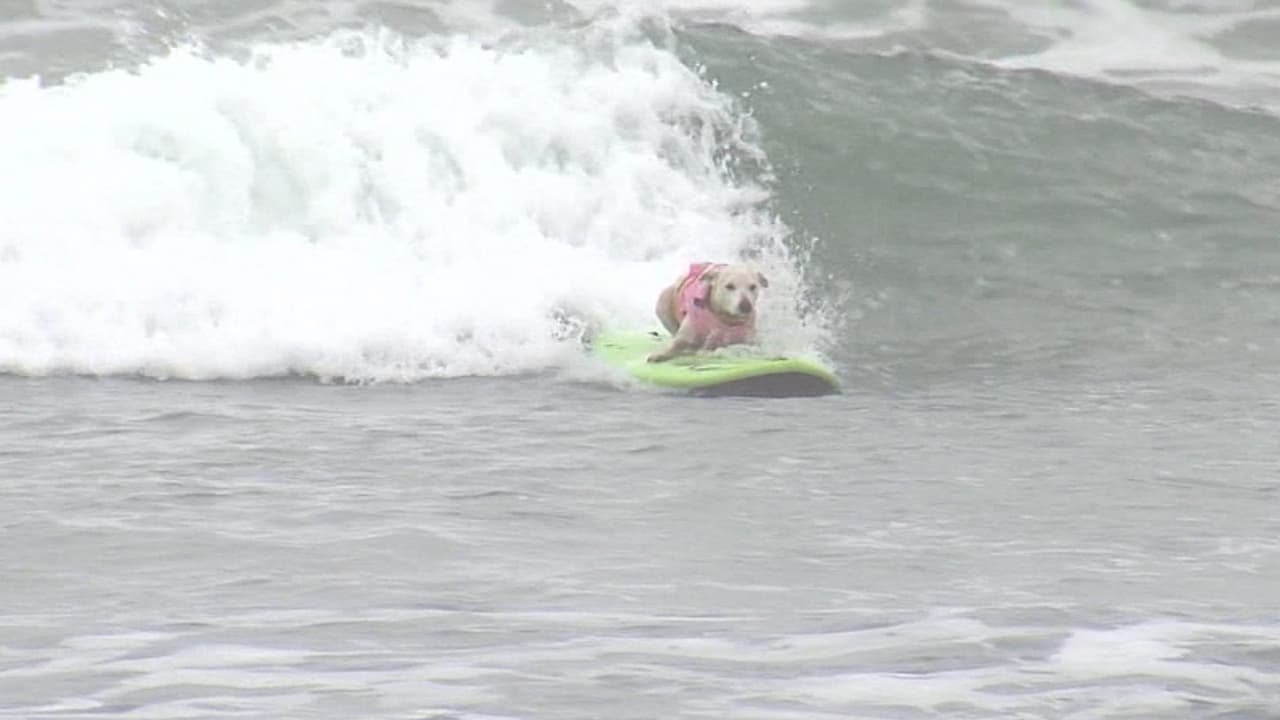 Más de 70 perros participaron en la decimotercera edición de una maratón de surf dedicada a ellos en las playas de Del Mar, en California.