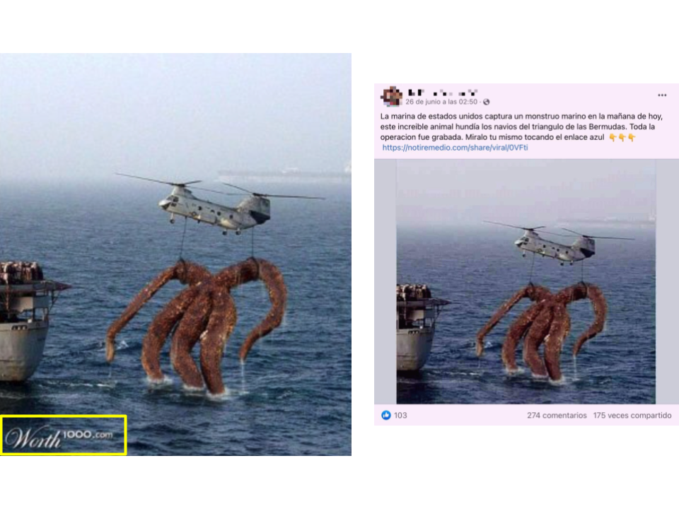 Es falso que la Marina de Estados Unidos capturó un “monstruo marino” en la “mañana de hoy”, como dice un post de Facebook sobre una supuesta foto en la que se ve un helicóptero de dos hélices transportando hacia un barco algo que parece un pulpo enorme con cinco tentáculos. La imagen ya circulaba en 2013 en una web sobre creaciones digitales.
