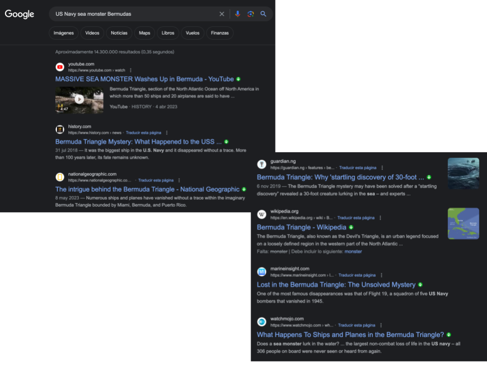 Google. Búsqueda con las palabras, en inglés, “Marina Estados Unidos monstruo marino Bermudas”. Consultado el 28 de junio de 2023.