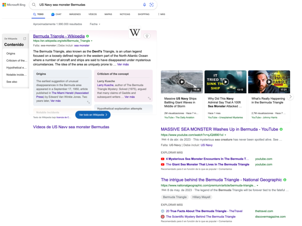 Bing. Búsqueda con las palabras, en inglés, “Marina Estados Unidos monstruo marino Bermudas”. Consultado el 28 de junio de 2023.