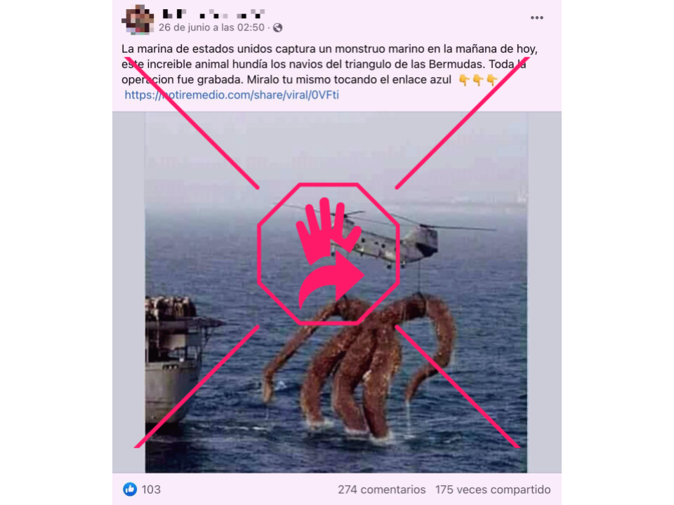 Es falso que la Marina de Estados Unidos haya capturado un “monstruo marino” en Bermudas “en la mañana de hoy”, como dice una publicación en Facebook. Una búsqueda inversa en Google de la imagen que acompaña a esa afirmación revela que fue difundida ya en octubre de 2013, hace casi 10 años, en una web, ya desaparecida, de creación de imágenes digitales. Además, el enlace que facilita el post para ver la supuesta operación militar redirige a un enlace publicitario que invita a descargar un bloqueador de contenido no deseado para la web. Tampoco hay información en la web de la Marina estadounidense o en medios de prestigio que recoja tal captura. Lee aquí cómo escogemos y asignamos nuestras etiquetas en elDetector.