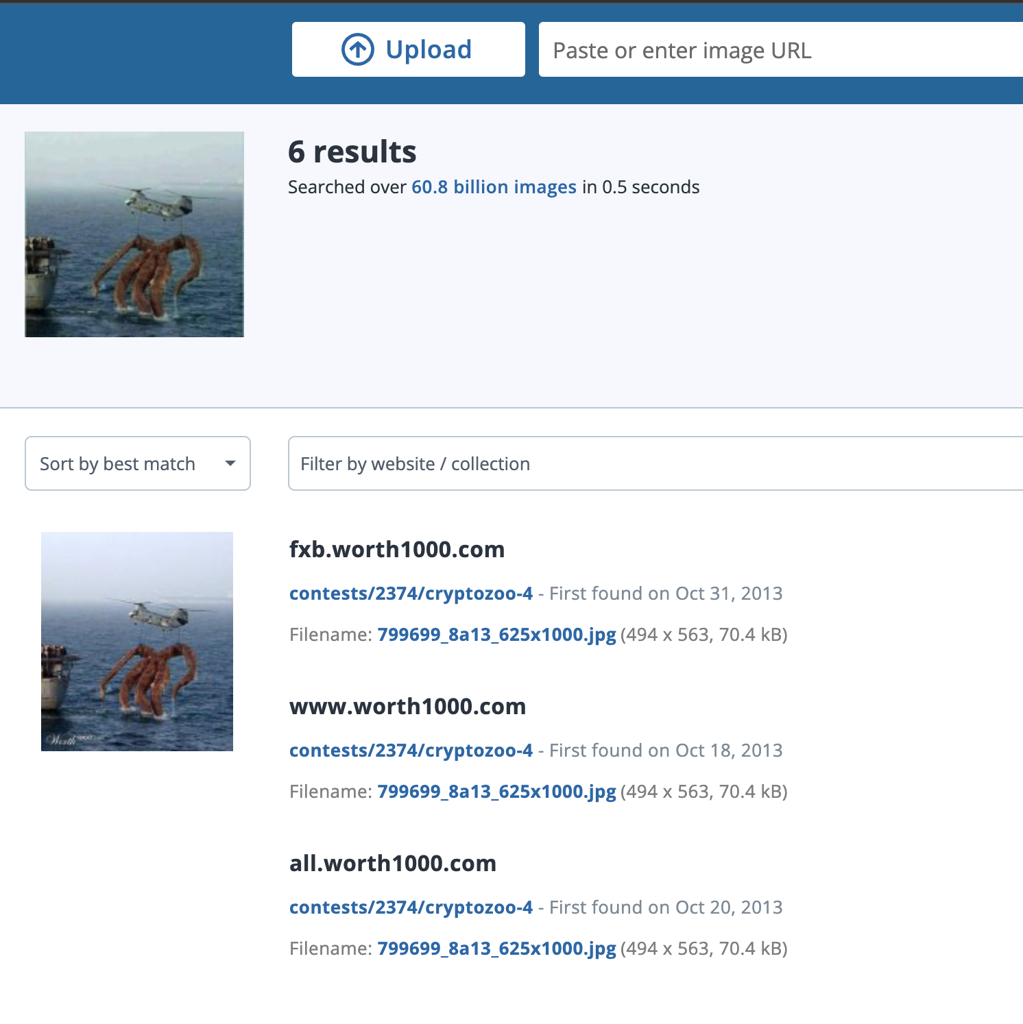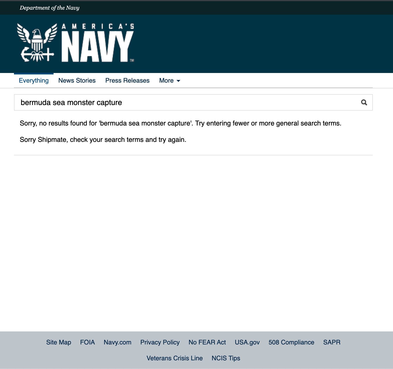 Una búsqueda en Google, Yandex y Bing con las palabras clave, en inglés, “Marina Estados Unidos monstruo marino Bermudas”, no da resultados en medios de comunicación de prestigio sobre esta supuesta captura por parte de las fuerzas armadas estadounidenses. Tampoco da ningún resultado buscar en la web de la Marina con las palabras, en inglés, “monstruo bermuda”, “mar, Bermuda, captura” o “Bermuda, monstruo marino, captura”.