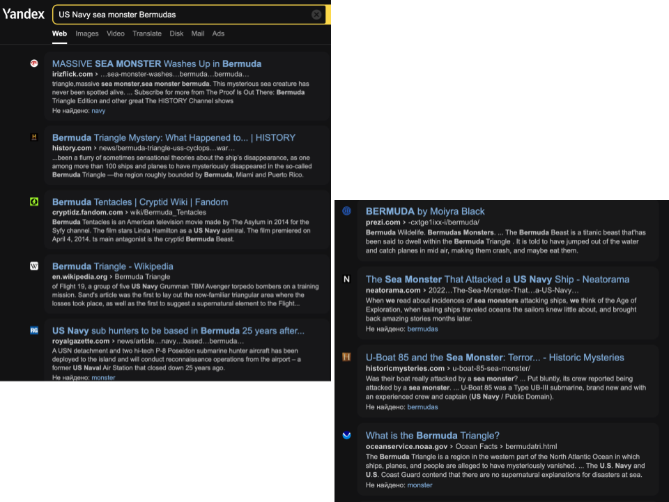 Yandex. Búsqueda con las palabras, en inglés, “Marina Estados Unidos monstruo marino Bermudas”. Consultado el 28 de junio de 2023.
