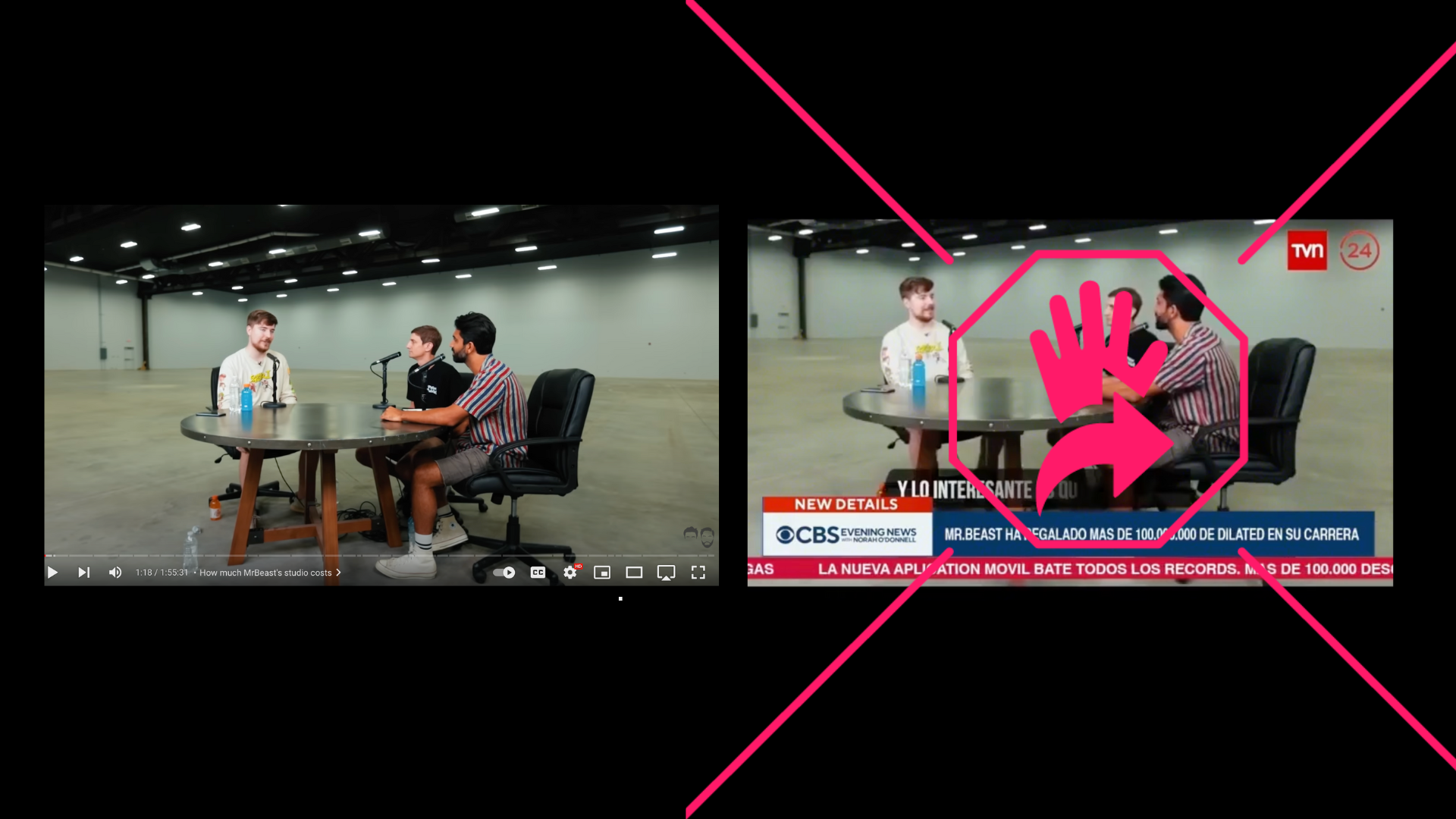 Sin embargo, también identificamos diferencias: en ninguna parte aparece O’Donnell ni el logo de CBS con la mención al noticiero que ella conduce que sí se ve en en el área inferior del video desinformante. Tampoco se observa en la esquina superior derecha el logo de TVN (Televisión Nacional de Chile) ni en la parte inferior de la pantalla la frase “Mr.Beast ha regalado más de 100.000,000 de dilated [sic] en su carrera” o el cintillo que va rotando durante todo el video manipulado que dice: “La nueva aplication [sic] móvil bate todos los récords. Más de 100,000 descargas”.