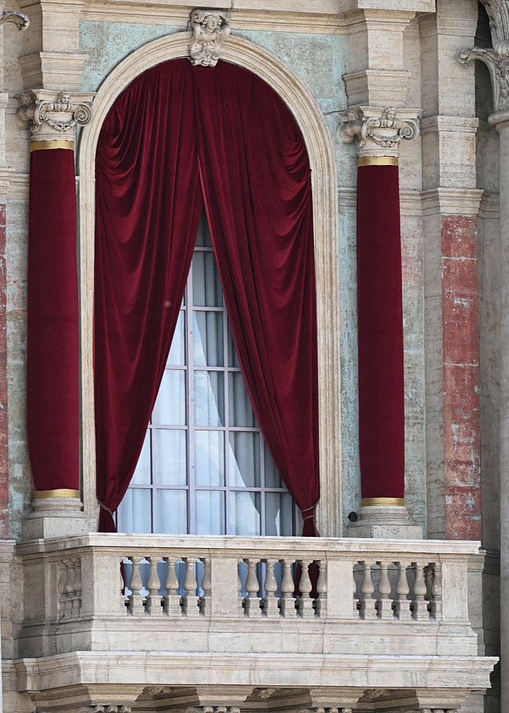 La ventana central del balcón de la Basílica de San Pedro, decorada con largas cortinas rojas, ya está lista para que se asome por primera vez el papa que salga elegido en el cónclave que se inició hoy, 7 de mayo.