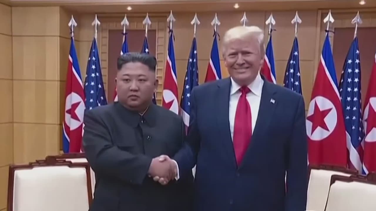 En el momento en que se pronuncia la palabra "tirano", aparece una foto del histórico apretón de manos entre Trump y el dirigente norcoreano Kim Jong Un, en Singapur en junio de 2018.