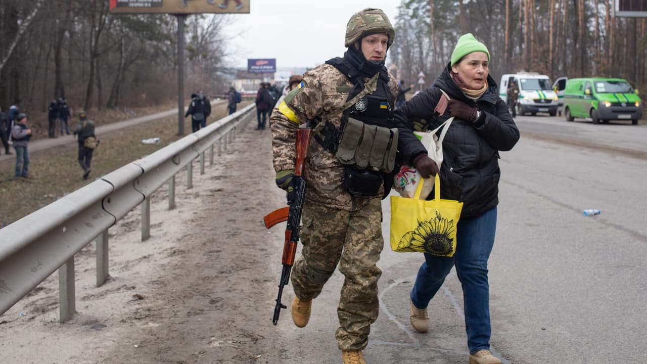 El periodista responde que a donde están evacuando a la gente, en el interior de Irpin. El puente termina en una rotonda que, a mano derecha, tiene una gasolinera y a la izquierda, una posición elevada del Ejército de Ucrania luchando contra los rusos a muy corta distanci con Ak-47 y ametralladoras. En la gasolinera un soldado atrincherado nos grita “¿Quiénes sois? ¡Fuera de aquí". "Son periodistas”, responde una voz de otro soldado que se encuentra en la parte alta del edificio de la gasolinera .
