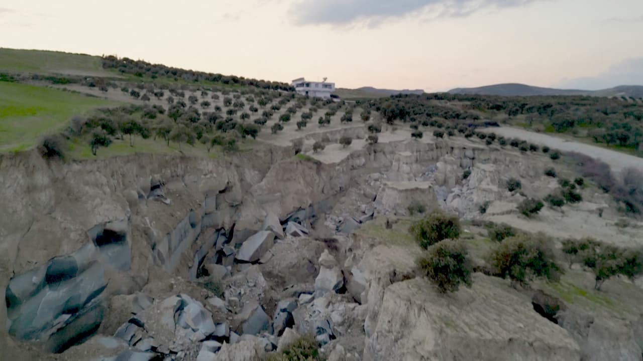 Un dron sobrevoló las tierras de una plantación de olivas en la provincia de Hatay, en el sur de Turquía, y muestra la extensa fisura sísmica producida por el terremoto de magnitud 7.8 el 6 de febrero. Sigue todas las noticias en Univision.