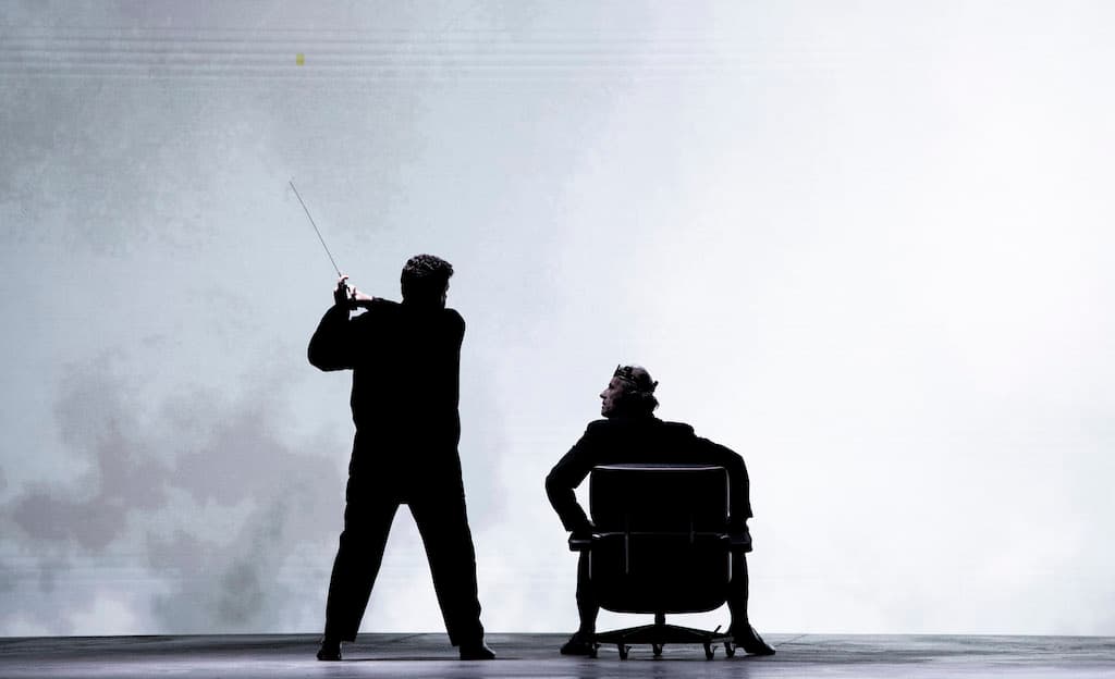 La ópera comienza con un Macbeth conduciendo un coche junto a Banco ( Jongmin Park) y nos traslada al espacio de cualquier ciudad moderna en una representación cinematográfica, auxiliada de pantallas y una puesta en escena que busca sumergir al espectador dentro del escenario.