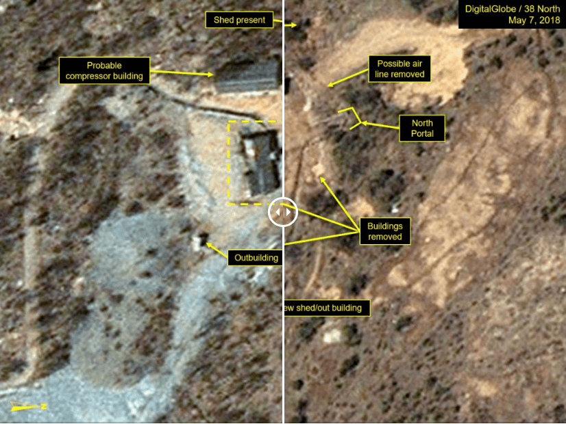 El sitio 38North aseguró que las imágenes de satélite fechadas el 7 de mayo mostraron "la primera evidencia definitiva de que el desmantelamiento del sitio de prueba ya estaba en marcha".