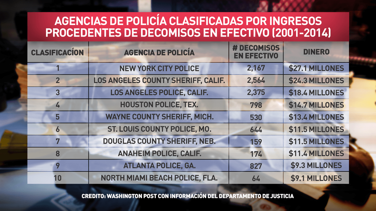 Una vez se determine la legalidad o ilegalidad del dinero y víctimas del crimen sean compensadas, el Departamento de Justicia, bajo una ley llamada Distribución equitativa de fondos reparte el dinero sobrante a los departamentos de policía que hayan estado involucrados en la investigación del caso. “Por ley, 65% va al departamento que confiscó, 35% se divide entre el estado y los fiscales, para continuar operaciones antidroga”.