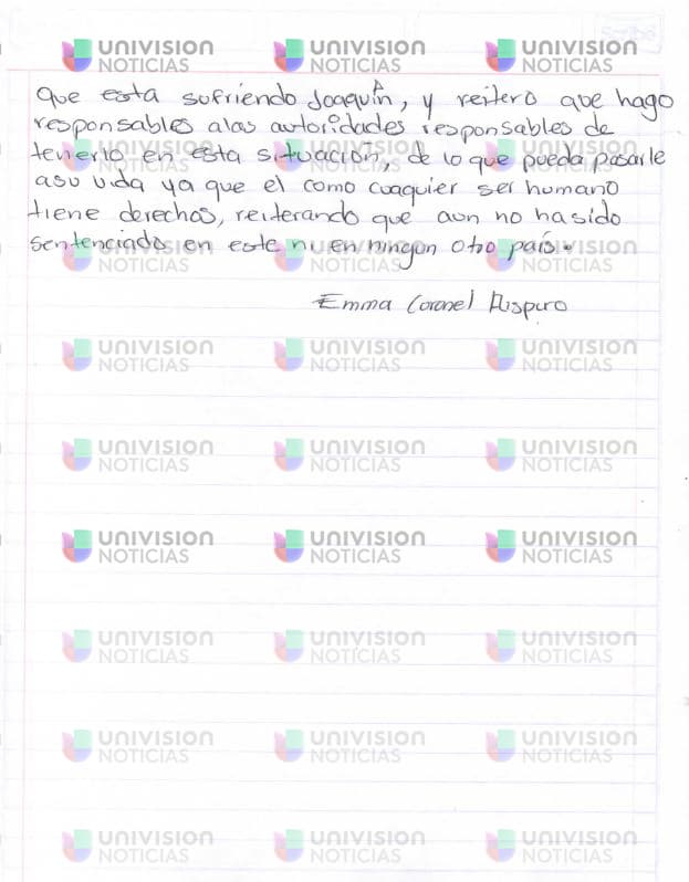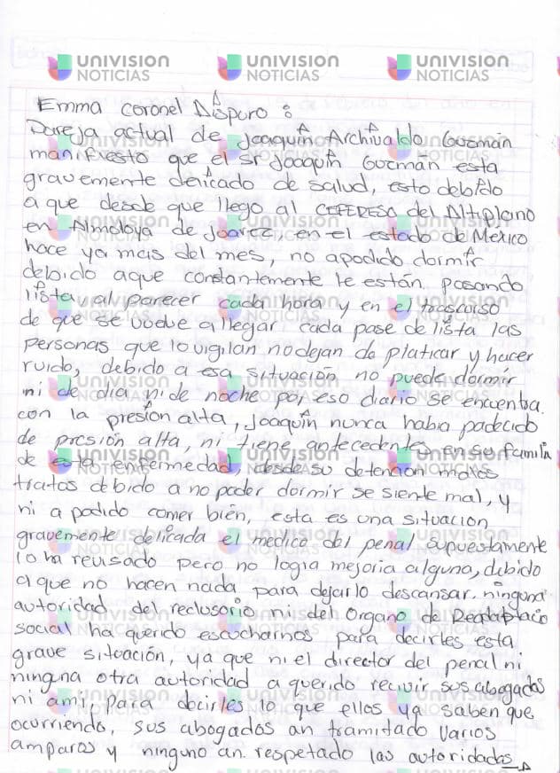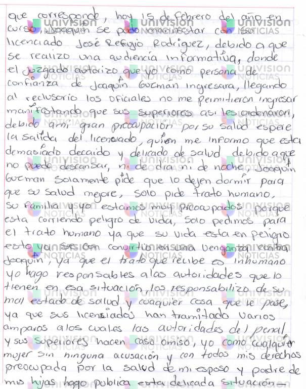 En la misiva, que muestra de manera exclusiva Univision Investiga, la esposa del capo desde 2007 sostiene que Guzmán "no ha podido dormir debido a que constantemente le están pasando lista, al parecer cada hora (...) las personas que lo vigilan no dejan de platicar y hacer ruido". La carta fue escrita el 15 de febrero.