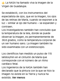 “La NASA ha llamado viva la imagen de la Virgen de Guadalupe”, dice el texto de diversos posts difundidos en Facebook entre marzo y abril de 2024, publicados junto a una conocida imagen de esa virgen. Algunos de ellos han sido compartidos miles de veces y acumulan también miles de reacciones.