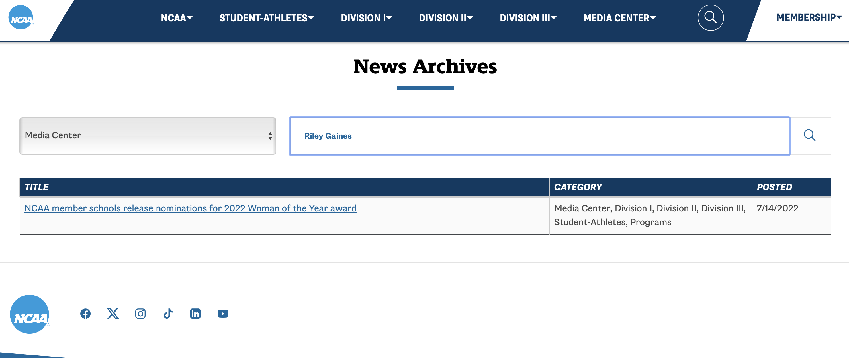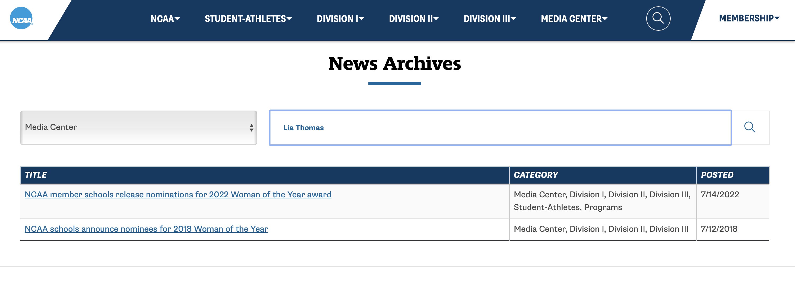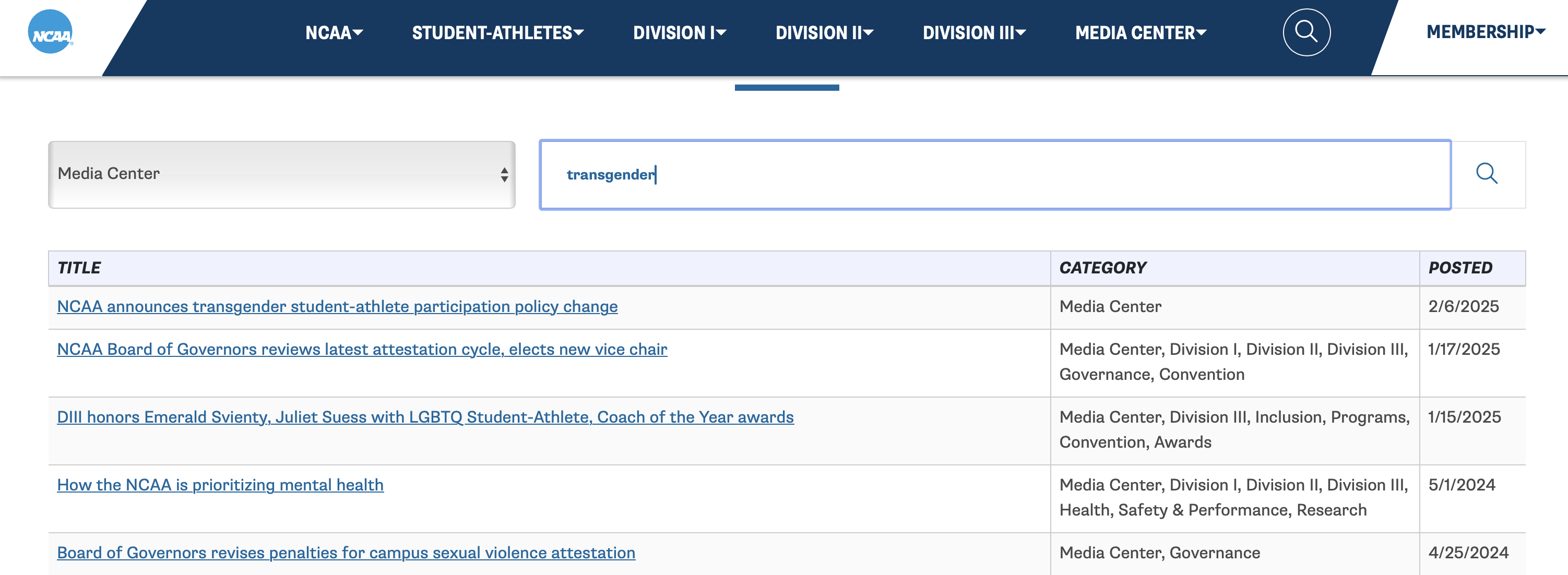Realizamos, además, búsquedas en el sitio oficial de la asociación, en la sección “centro de medios”, utilizando los nombres de las deportistas y la palabra “transgénero” en inglés pero, entre los resultados arrojados, no encontramos declaraciones o comunicados que respalden el supuesto retiro de récords deportivos a participantes trans, como ha sido solicitado por el Departamento de Educación de Estados Unidos en febrero de 2025. Esta solicitud surge, según explican, “tras el cambio de política de la NCAA para alinear su normativa con la medida de Trump de mantener a los hombres fuera de los deportes femeninos”.