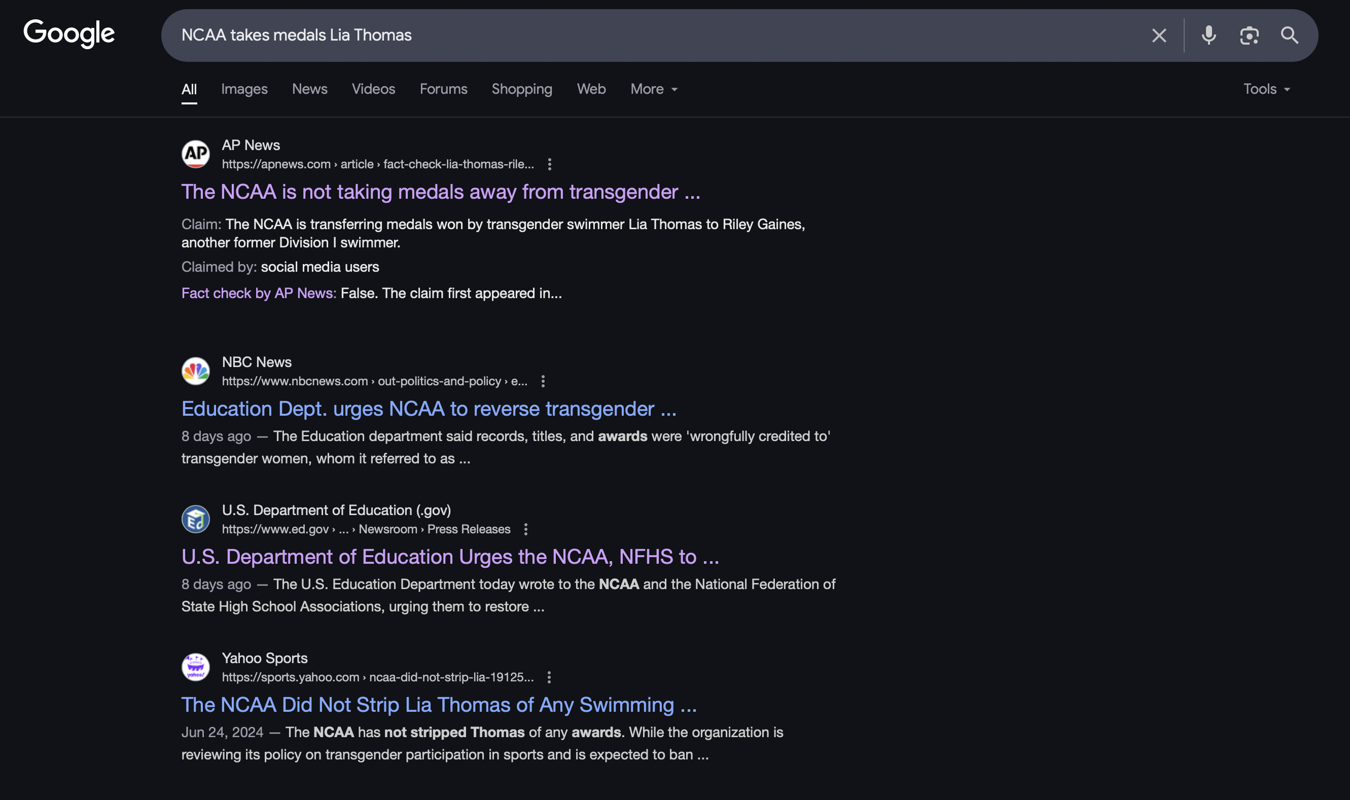 En busca de información adicional, hicimos otra búsqueda, esta vez en Google, utilizando palabras clave en inglés y no encontramos información que respalde el post desinformante. Sin embargo, confirmamos que esta misma desinformación fue desmentida en otro contexto, por Associated Press un portavoz de la NCAA, afirmó a este medio en aquel entonces que “los resultados de la carrera son finales”, según una nota publicada en 2023.