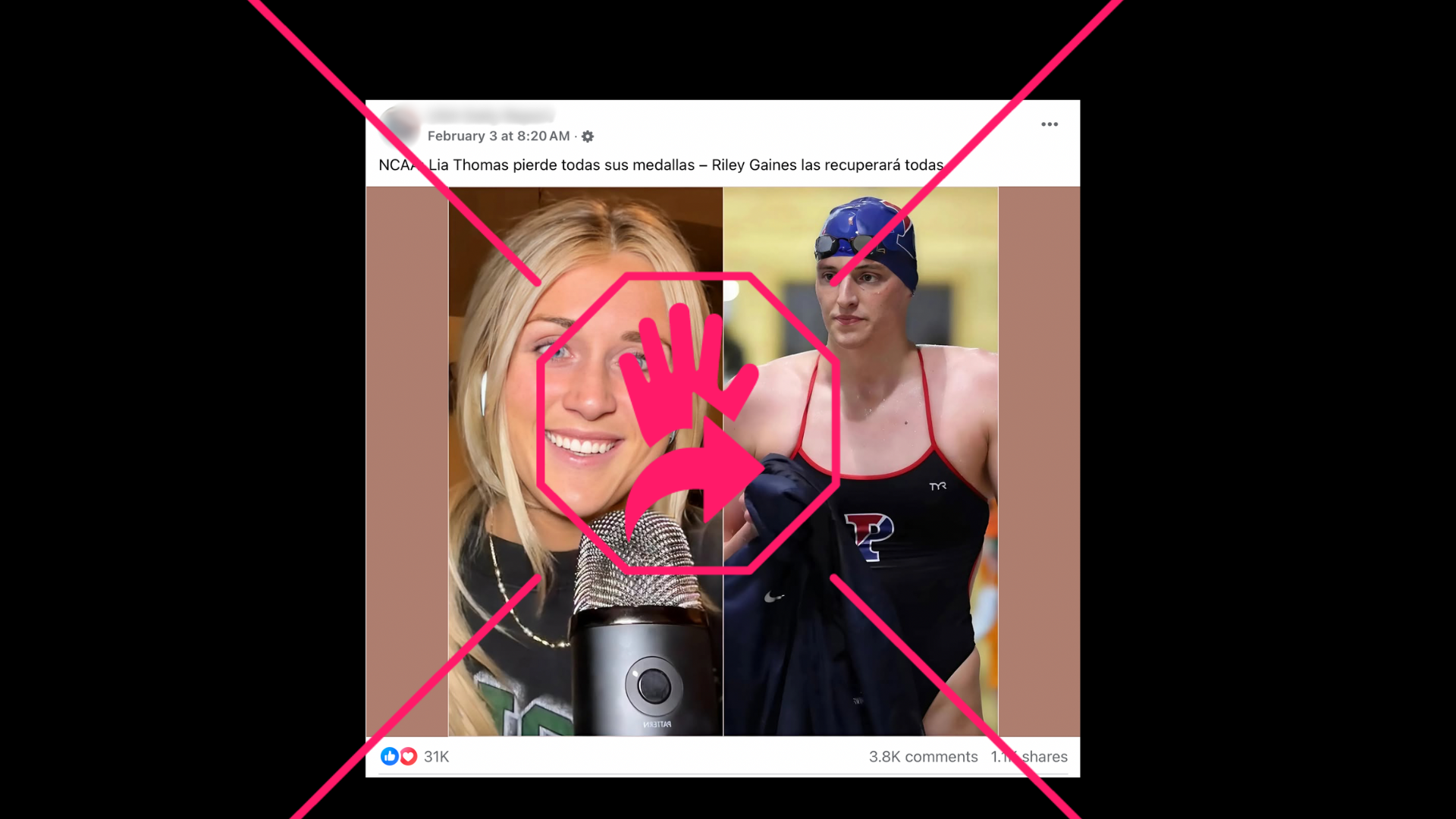 Circula en Facebook una publicación que afirma falsamente que la atleta “Lia Thomas pierde todas sus medallas” y “Riley Gaines las recuperará todas”, sugiriendo que la Asociación Nacional de Atletismo Universitario (NCAA, por sus siglas en inglés) despojó a la nadadora transgénero Thomas de sus “medallas” y se las otorgó a Gaines, una exnadadora universitaria que ha criticado la participación de mujeres trans en competencias femeninas. La misma organización lo desmintió.