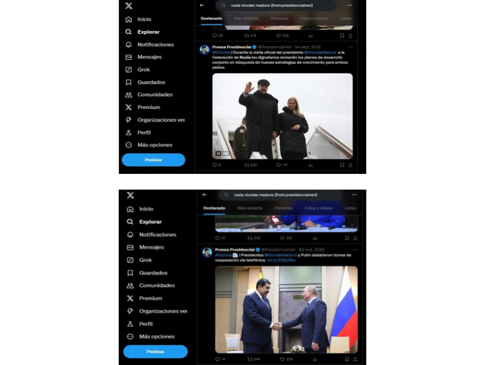 Con una búsqueda en X Search Advanced, encontramos que la última vez que Maduro pisó Rusia, y que fue registrada por su Prensa Presidencial, fue en septiembre de 2019, para “revisar planes de desarrollo en conjunto”. En 2022, Putin y Maduro hablaron por teléfono.