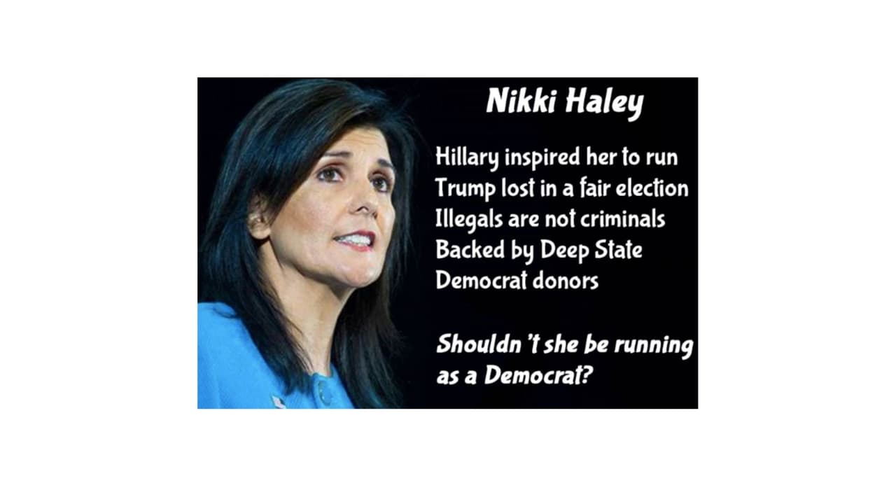 "Hillary [Clinton] le sirvió de inspiración para que ella se presentara [como precandidata a la Casa Blanca]. [Haley dice que] Trump perdió unas elecciones justas [en 2020]. Que los inmigrantes ilegales no son criminales. Ella tiene el apoyo del Estado profundo. Y cuenta con donantes demócratas. ¿No debería ser candidata del Partido Demócrata?", decía, en inglés, el texto de la imagen.