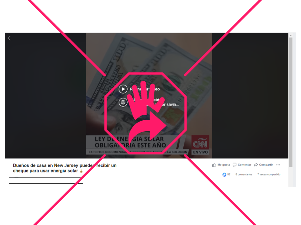 La publicación en Facebook no corresponde a un sitio web del gobierno de Estados Unidos ni del estado de Nueva Jersey, sino que se hizo desde una cuenta particular en esa red social, específicamente de una empresa que, según señala, promete “ahorros solares”. La publicación insta a que las personas den clic a un enlace vinculado.
