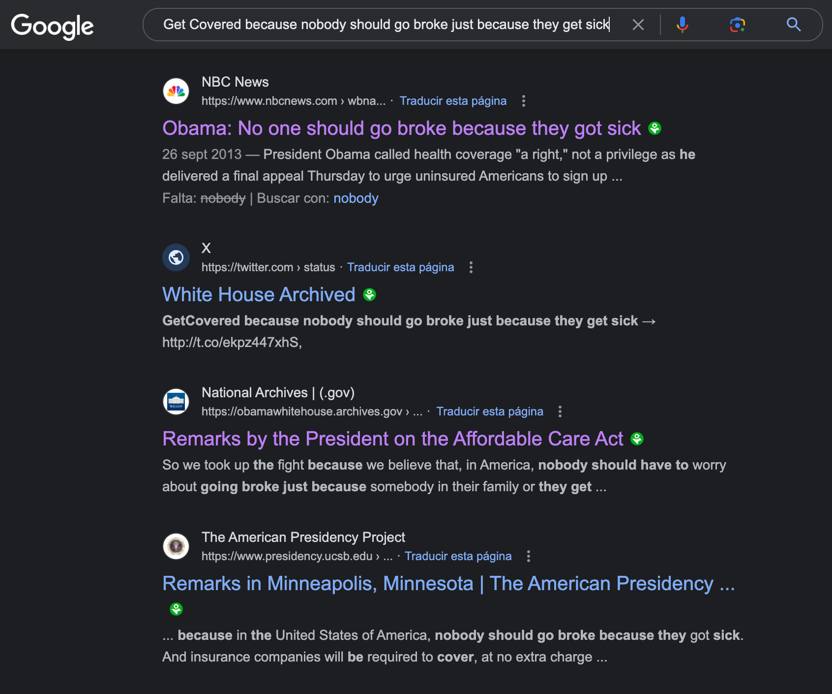 Una búsqueda en Google con la frase del cartel de la foto original facilita varias publicaciones de medios estadounidenses que citan esa frase hecha por el entonces presidente, por ejemplo, en septiembre de ese 2013, cuando se encontraba en plena campaña de promoción de la Ley del Cuidado de Salud a Bajo Precio (Affordable Care Act, en inglés), aprobada por su gobierno en marzo de 2010. También conocida coloquialmente como Obamacare, esa ley amplía la cobertura sanitaria al permitir que millones de personas puedan contar con un seguro médico subsidiado.