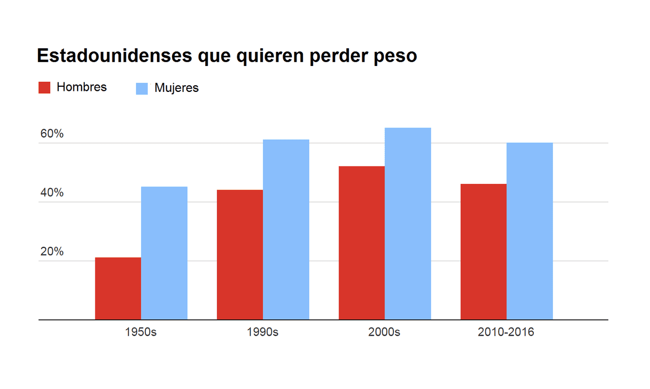 Con años ya en la epidemia de obesidad, millones de estadounidenses han intentado perder peso, y millones de ellos no lo han logrado a largo plazo. Es tan grave ahora que cerca del 40% de los estadounidenses son obesos. Hoy, la mujer promedio en Estados Unidos pesa alrededor de 168 libras, aproximadamente lo mismo que un hombre promedio en 1960. Y no es que las cinturas de los muchachos no se hayan inflado también. Los hombres han ganado en promedio casi 30 libras desde la toma de posesión de John F. Kennedy en 1961.