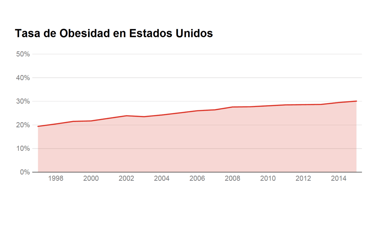 El porcentaje de la población total que es obesa ha aumentado del 19.4% en 1997 a más del 30% en 2015.