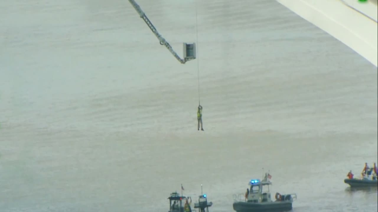 El incidente ocurrió luego que un camión chocara varios vehículos de los trabajadores que estaban sobre el Woodrow Wilson Bridge, cerca de Washington DC. Los hombres estaban encima de un camión grúa cuando fue golpeado. Todos fueron rescatados por las autoridades