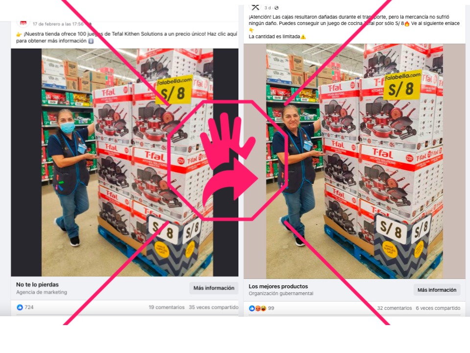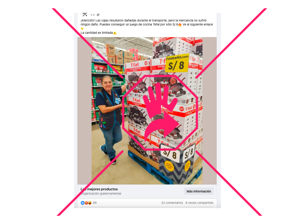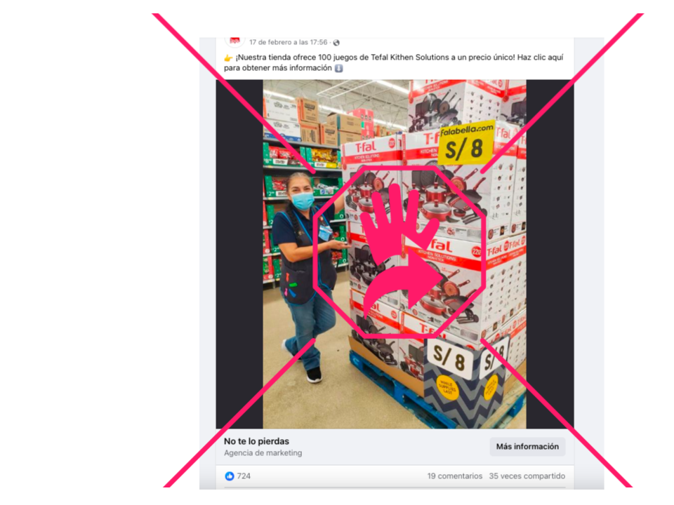 Son falsas esas publicaciones de Facebook que ofrecen supuestos juegos de cocina y otros utensilios a un precio de 8 soles o 10 reales (equivalente a unos dos dólares). La misma imagen de una mujer que parece empleada de una tienda señalando un lote de cajas con artefactos de cocina de la marca T-fal es difundida desde distintos perfiles de la red social con textos diferentes, que a veces anuncian una oferta especial aplicable a 100 unidades y otras veces explican que el descuento se debe a que los empaques resultaron dañados (incluso encontramos una versión en portugués). Sobre las cajas, además, hay etiquetas en las que se lee “falabella.com”, pero esa cadena de tiendas explicó a elDetector que sus promociones sólo están disponibles en su sitio web oficial y se desligó de cualquier post que redirija a los usuarios a páginas diferentes. Lee aquí cómo escogemos y asignamos nuestras etiquetas en elDetector.