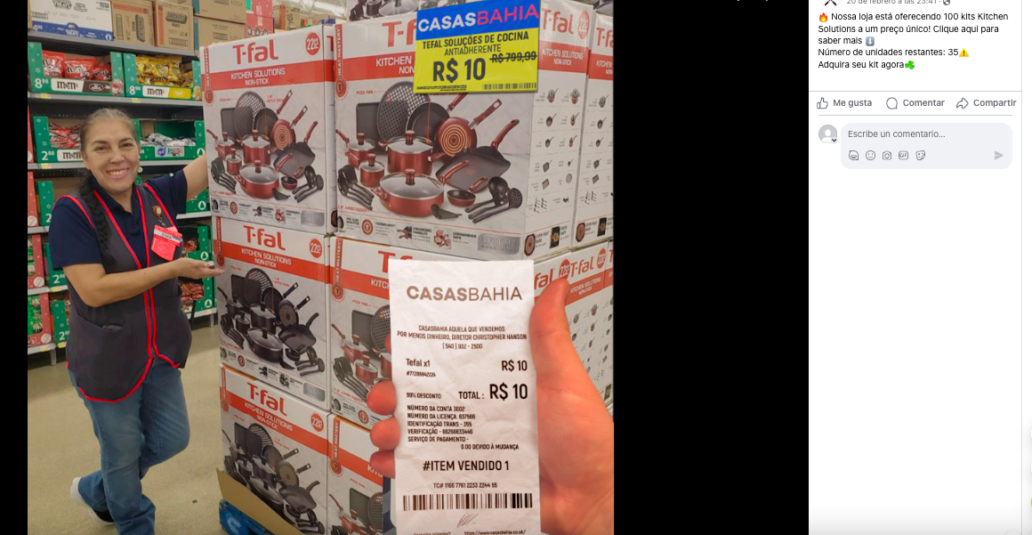 Incluso en elDetector encontramos que la misma imagen de los posts que estamos verificando está siendo difundida en Facebook con una etiqueta que muestra el nombre de una cadena de tiendas de Brasil y el mismo texto en portugués que asegura que la supuesta oferta es por 100 juegos de cocina a 10 reales (también unos 2 dólares), de los que solamente quedarían 35 disponibles.