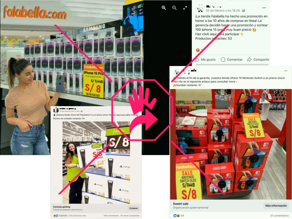 En el caso de la falsa oferta para un iPhone 15, en la imagen vemos a una joven que sostiene en su mano este modelo de celular frente a una estantería llena de cajas con el dispositivo. El precio que marca supuestamente Falabella es de 8 soles, algo más de 2 dólares, rebajado de los 5,449 soles que se indica en la etiqueta, unos 1,435 dólares, que costaría antes de la presunta rebaja.