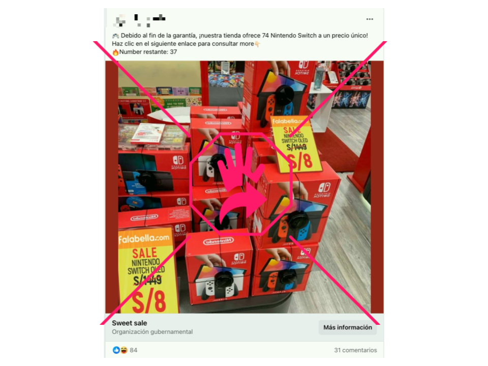 “Debido al fin de la garantía, ¡nuestra tienda ofrece 74 Nintendo Switch a un precio único! Haz clic en el siguiente enlace para consultar more [más]. Number [número] restante: 37”, dice el mensaje de la falsa oferta relacionada con aparatos de Nintendo, que incluye palabras en inglés. Como vemos, la estructura del mensaje es igual que la utilizada para las Playstation 5, solo que esta vez el supuesto motivo de la venta a 8 soles (algo más de dos dólares) es la garantía.