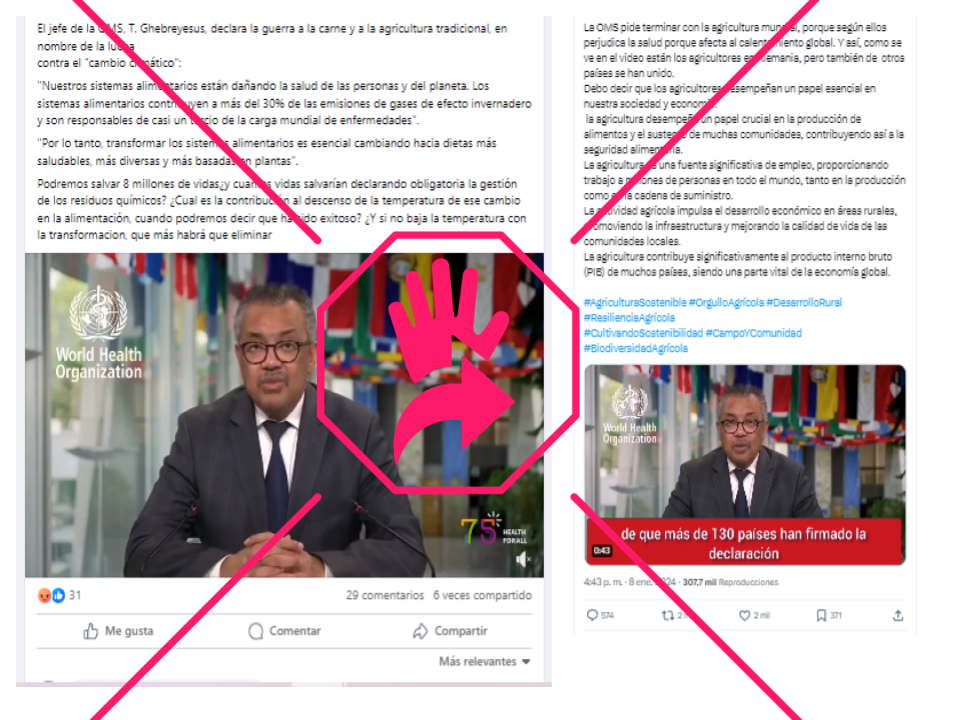 Es falso que la OMS pidió “terminar con la agricultura mundial”, como afirma un post que circula en X (antes Twitter) y Facebook. La publicación incluye un video en el que se ve a Tedros Adhanom, director general de la Organización Mundial de la Salud, hablando sobre la contribución de los sistemas de alimentación a las emisiones de gases de efecto invernadero, pero nunca pide acabar con la agricultura mundial. Desde el Departamento de Relaciones con los Medios de la OMS respondieron a elDetector que la OMS nunca ha hecho un llamamiento para poner fin a la agricultura y que la afirmación es falsa. También revisamos la grabación del discurso completo de Adhanom y la declaración de la COP28 sobre clima y salud (de la que hace mención el director de la OMS) y no hay petición alguna de acabar con la agricultura mundial. Lee aquí cómo escogemos y asignamos nuestras etiquetas en elDetector.